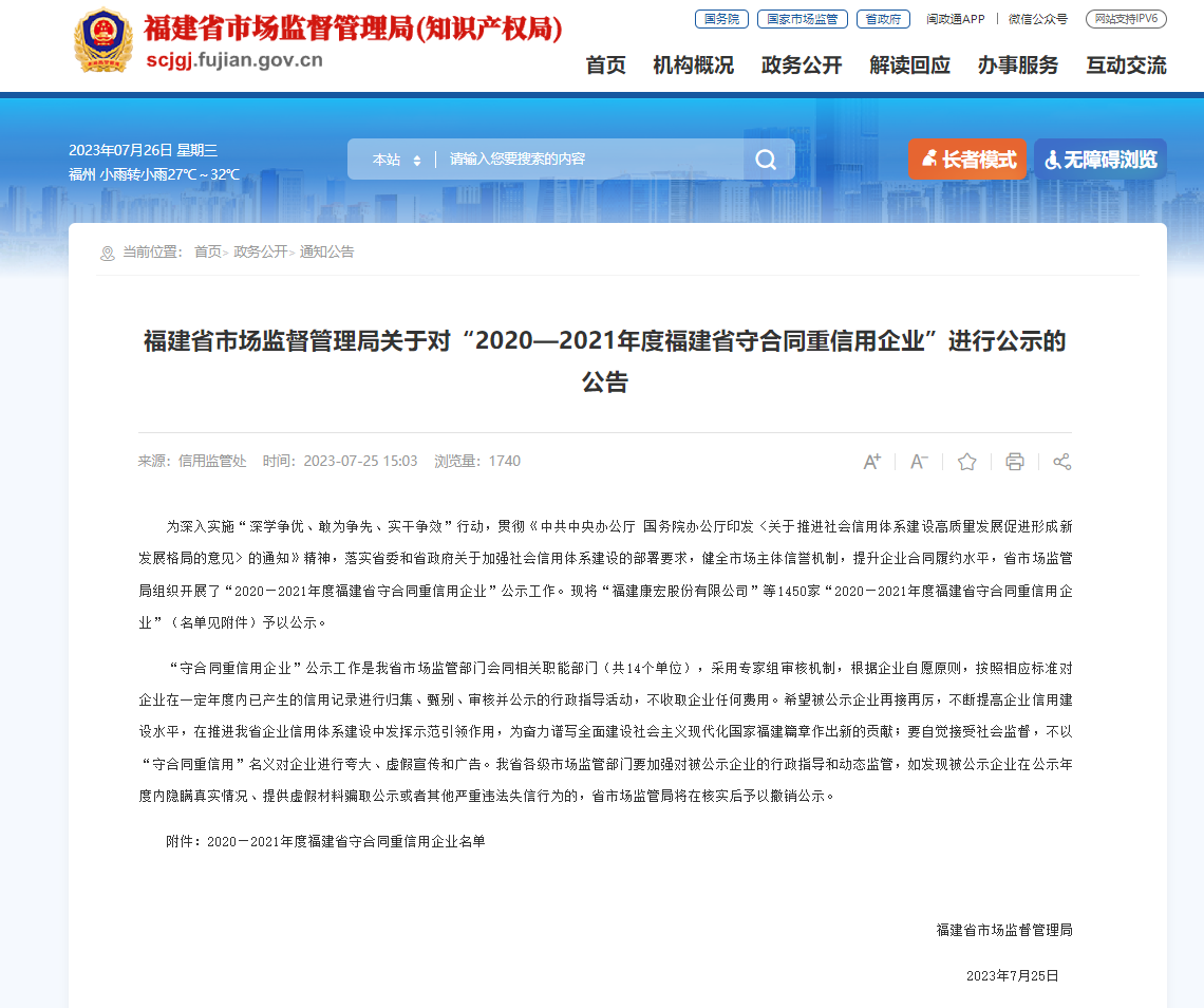 福建瓦力体育股份有限公司 荣获“福建省守合同重信用企业”荣誉称号